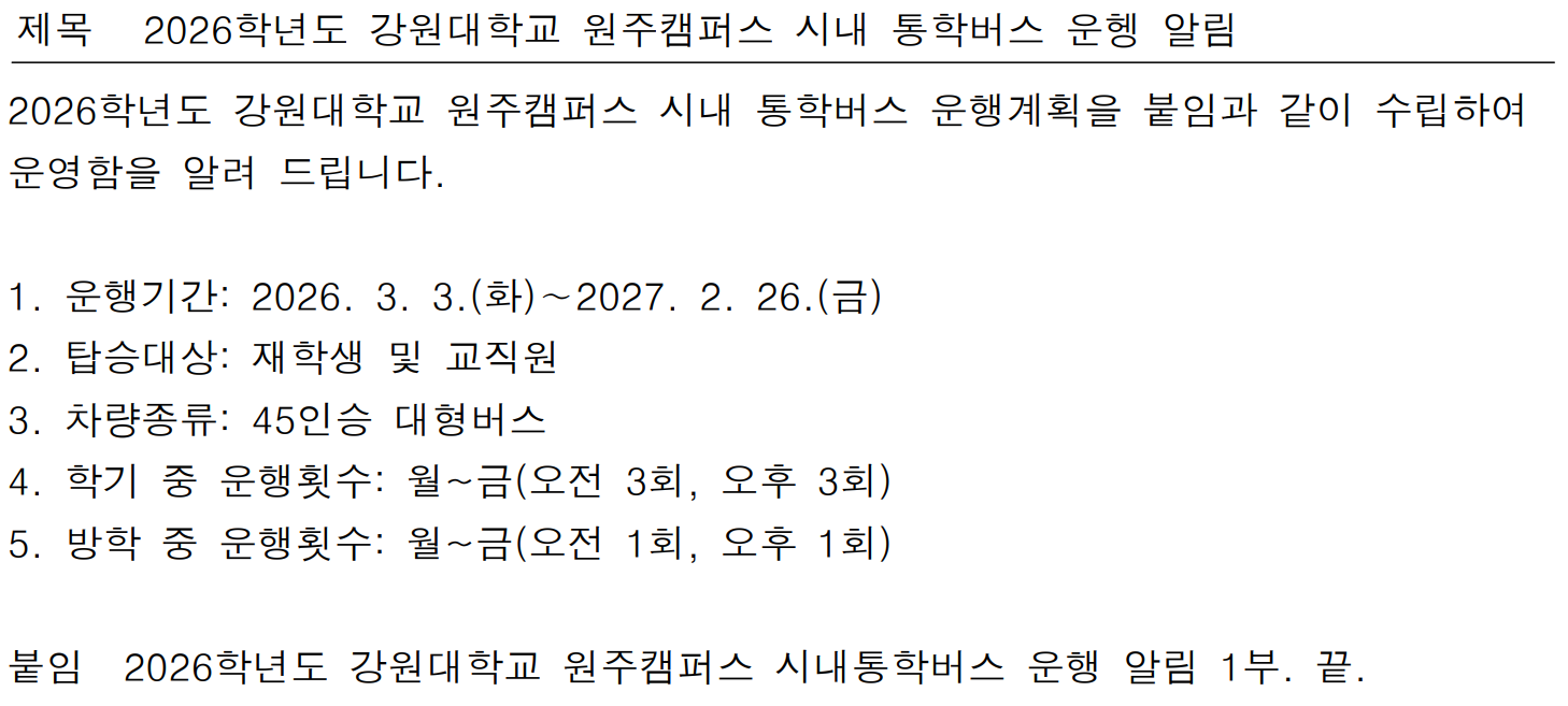 2026학년도 강원대학교 원주캠퍼스 시내 통학버스 운행 알림