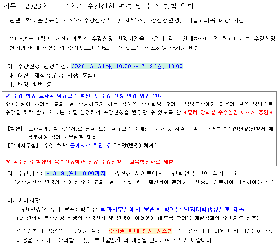 2026학년도 1학기 수강신청 변경 및 취소 방법 알림