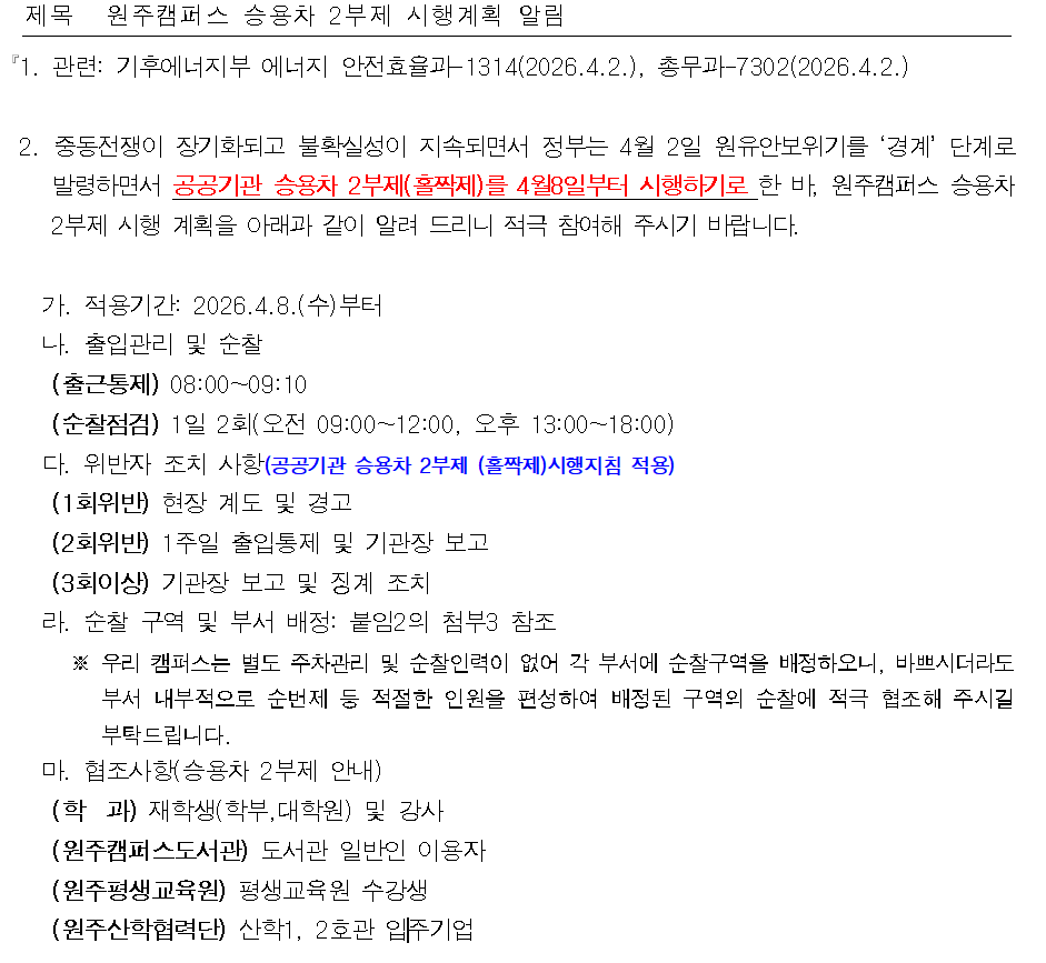 원주캠퍼스 승용차 2부제 시행계획 알림