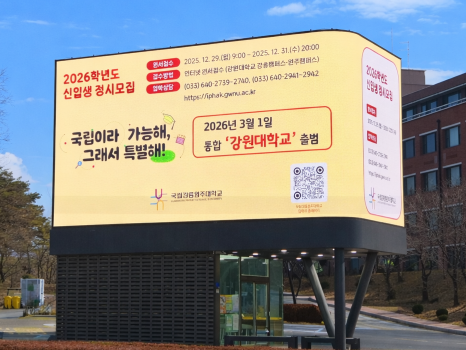 입학처는 대학 통합에 따른 명칭 변경과 정시모집 전형 등 주요 변경 사항을 수험생들에게 보다 쉽게 안내하기 위해, ‘강원대학교 강릉캠퍼스·원주캠퍼스’ 접수 방법과 정시모집 전형 내용을 담은 40~50초 분량의 숏츠(Shorts) 영상을 제작해 정시모집 기간 동안 적극 홍보하고 있다.